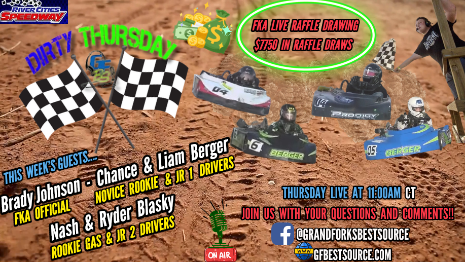 🏁🏁Today, June 27, 2024 at 11am CT - Tune in to Grand Forks Best Source for River Cities Speedway presents Dirty Thursday. FKA Official, Brady Johnson, Novice Rookie driver, Chance Berger, Rookie Gas driver, Nash Blasky, Jr 1 driver, Liam Berger, & Jr 2 driver, Ryder Blasky will be on the show for the annual FKA Live Raffle Drawing!