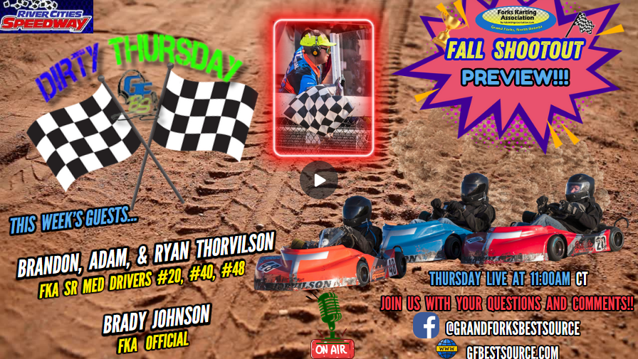 This Thursday, September 12th, at 11am tune in to Grand Forks Best Source - www.gfbestsource.com or Facebook @grandforksbestsourcefor River Cities Speedway presents Dirty Thursday. FKA Sr Med drivers, Brandon, Adam, & Ryan Thorvilson andForks Karting Association Official, Brady Johnson are this week's guests to reflect on the FKA season, and preview Forks Karting Speedway's State Championship Season Finale this Saturday! Join the conversation with your questions and comment!!!